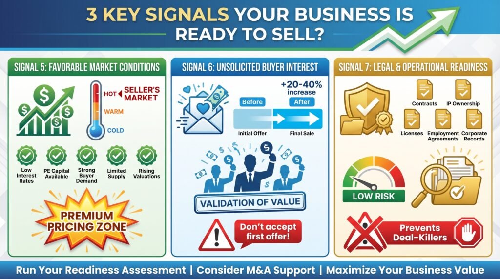 - Signal 5: Market conditions are favorable for sellers — Low interest rates, abundant private equity capital, strong buyer demand, limited quality supply, and rising valuation multiples create a seller’s market. Industry consolidation or sector-specific trends can also drive premium offers.
