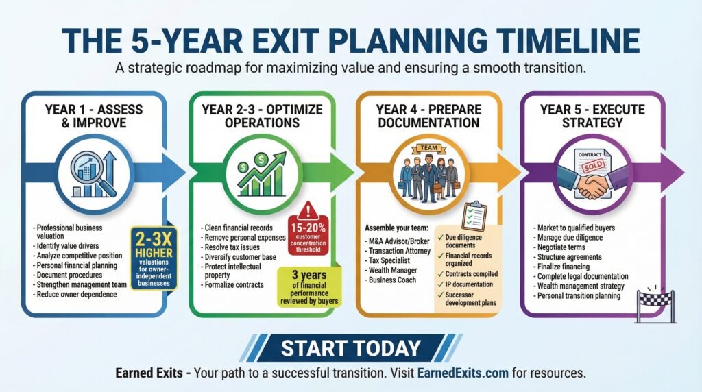 - Year 1: Establish valuation baseline and reduce owner dependence