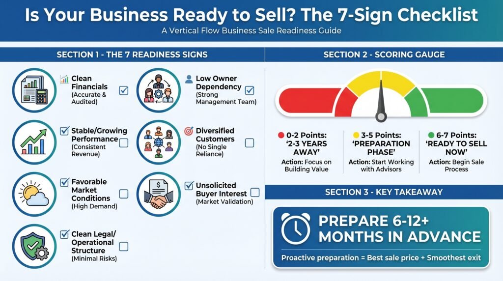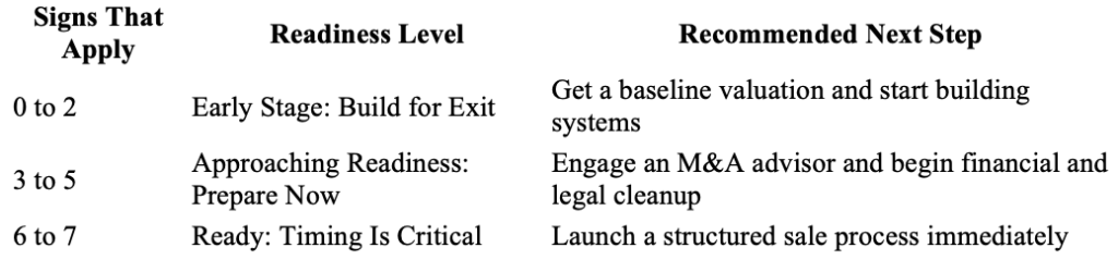 Score yourself on these signs: 0–2 means you’re 2–3 years away and should focus on building value; 3–5 means you’re in the preparation phase and should start working with advisors; 6–7 means you’re ready to sell now. The key message is to prepare proactively 6–12+ months in advance for the best sale price and smoothest exit.