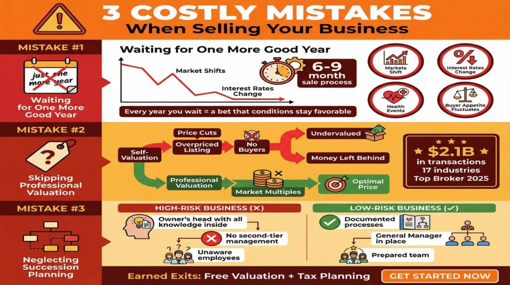 The “one more good year” trap is one of the costliest decisions a business owner can make. The logic feels sound; a stronger year means a higher valuation. But the hidden cost is time. Markets shift. Interest rates change. Buyer appetite fluctuates. Health events happen. And the energy required to present your business confidently to buyers and navigate a 6 to 9-month sale process is not unlimited. Every year you wait is a year you are betting that conditions, internal and external, will remain favorable. That is a bet many owners lose.