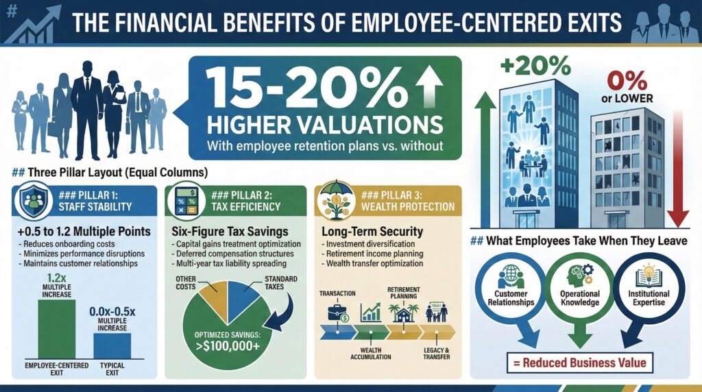 • Businesses with protected employee interests typically command 15-20% higher valuations than those focused solely on financial metrics