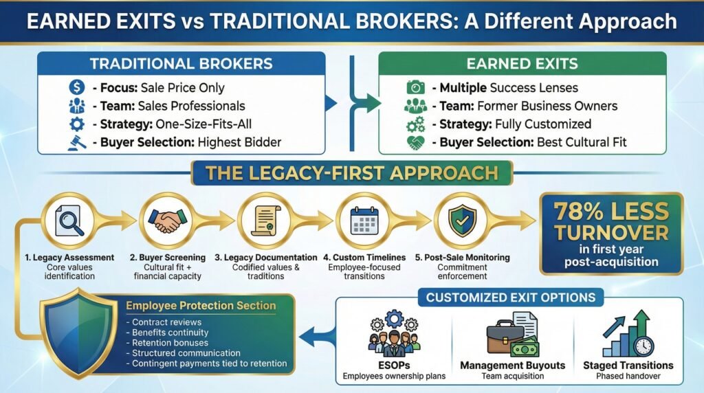 The fundamental distinction lies in their balanced focus on financial outcomes and legacy preservation. Traditional brokers typically measure success solely by purchase price, sometimes sacrificing long-term business health for short-term valuation.