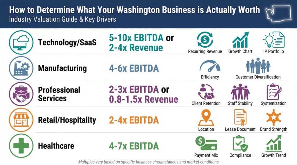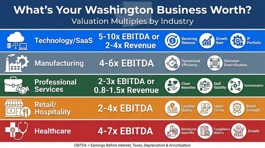 - Timing is crucial – most Washington businesses take 6-9 months to sell, with tech and healthcare companies selling faster.