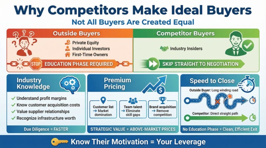 Most owners hesitate because it feels like handing the keys to a rival. But when done right, it’s often the fastest path to the highest payout. Competitors already understand your market, your customer base, and why what you’ve built has real value. That shared knowledge speeds everything up and can push the sale price well above what a typical outside buyer would offer.