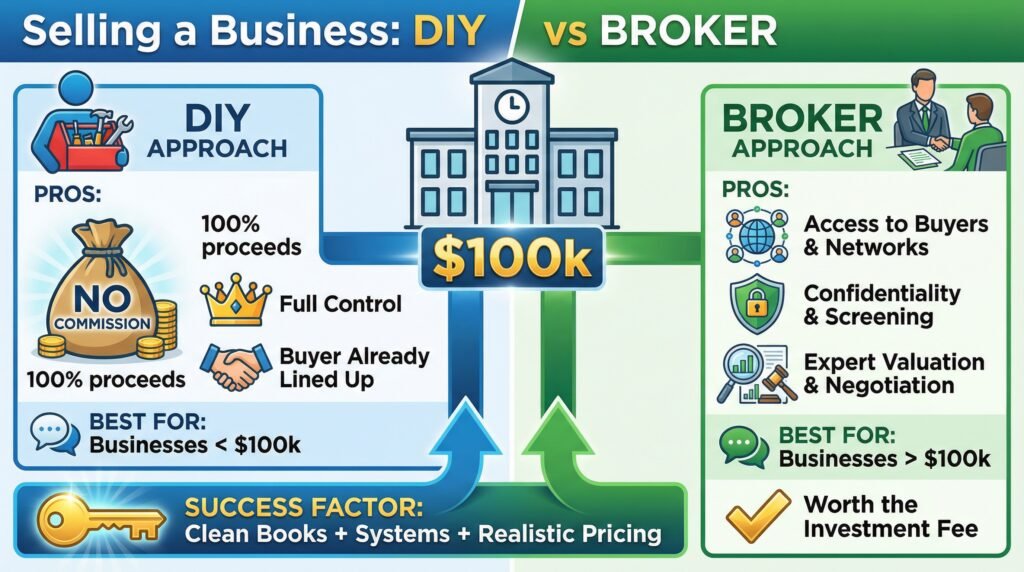 A DIY approach involves no broker commission, you keep 100% of the proceeds (minus other professional fees), full control over the process, and is feasible for businesses under $100k or if you already have a serious buyer.