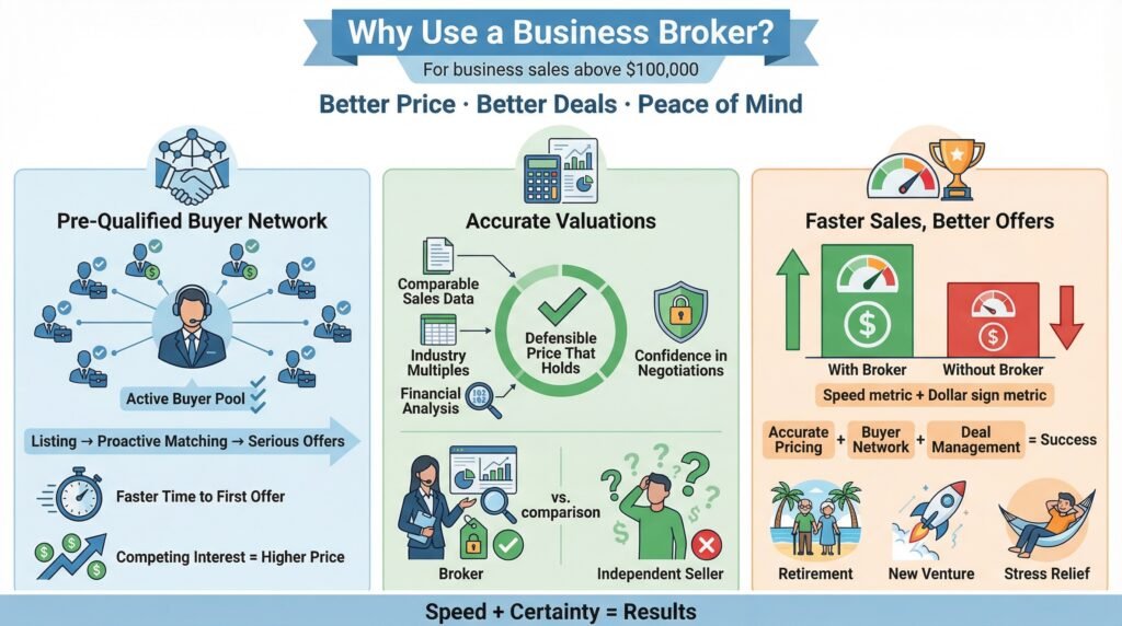For the majority of business sales, particularly those above $100,000 in value, working with a broker doesn’t just simplify the process. It fundamentally changes what’s possible in terms of final price, deal quality, and peace of mind. Here’s where brokers make a measurable difference.