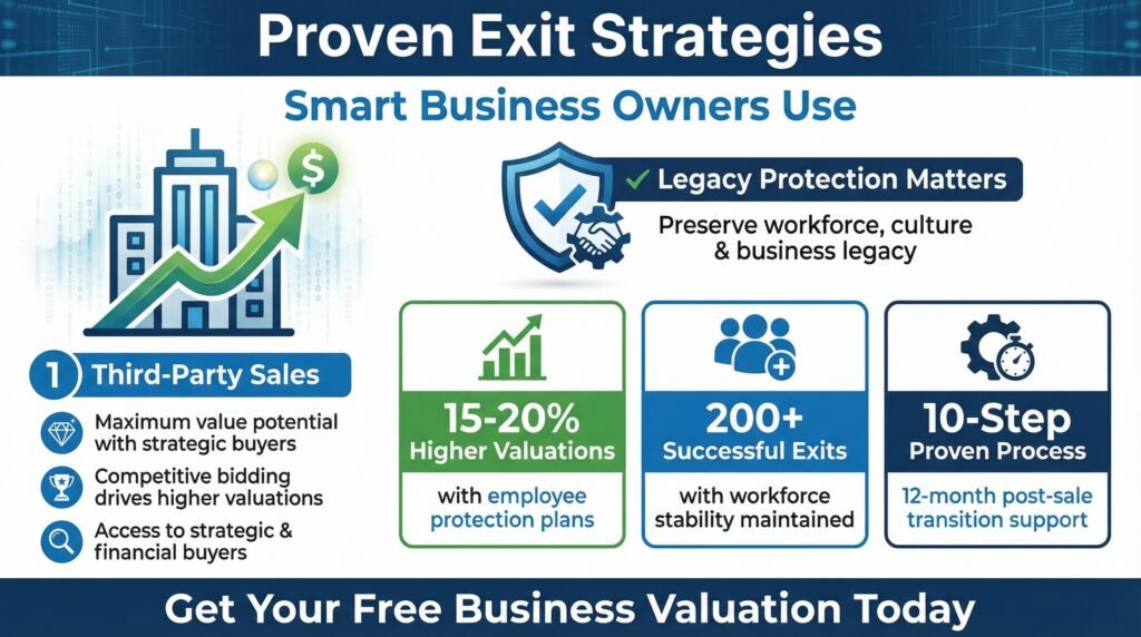 Third-party sales typically command the highest multiples, especially when strategic buyers see synergistic value in your operations, customer base, or proprietary technology. The process usually involves working with business brokers or investment bankers who can create competitive bidding situations to drive up your valuation.